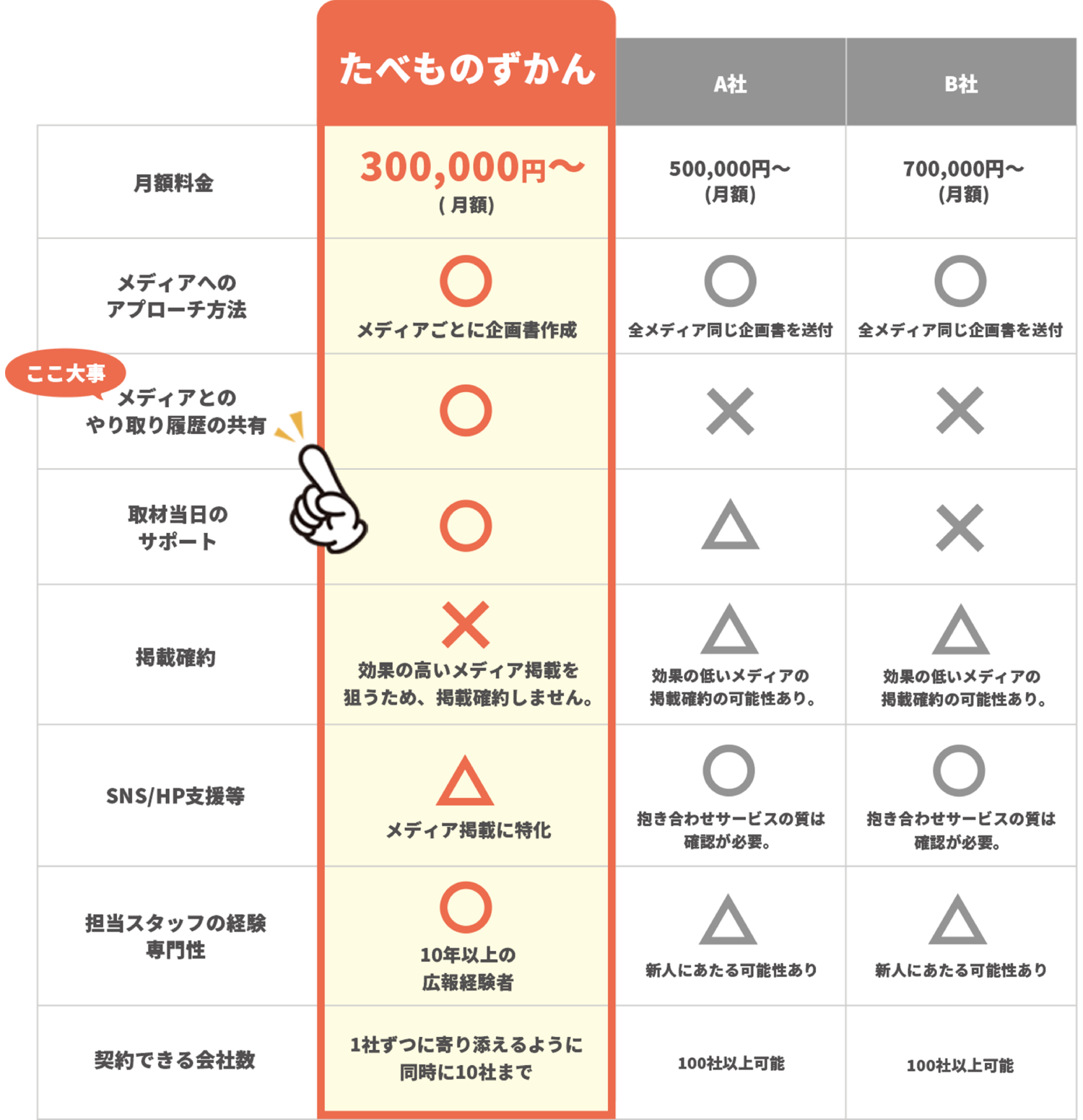 A 無駄なオプションを省き、「メディア掲載」に特化しているからです。専門とは言えないHP制作やSNS運用などを抱き合わせたプランではなく、本当に必要な広報設計に絞っているため、コストを抑えながらも高い成果が期待できます。さらに、担当するのは飲食店広報に豊富な経験を持つプロフェッショナルのみ。現在は5人体制 で、誰が担当しても一定以上のクオリティを保てる体制を整えています。属人性や新人対応の心配もありません。