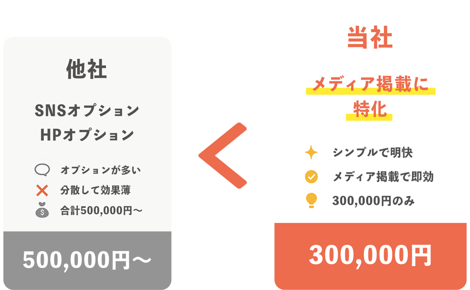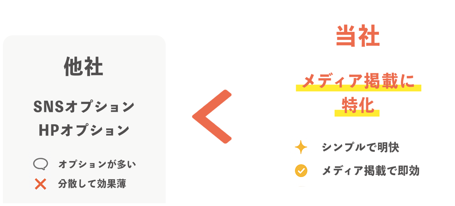 しかし、掲載確約をすると、安定的な集客効果に繋がるブランド認知の形成効果が低いメディア掲載も狙うことになってしまうため、掲載確約はしておりません。例えば、掲載料を払えば誰でも掲載できてしまうメディアに、掲載出来たところで、意味はないと考えています。私達は、「安定的な集客効果」という成果につながるメディア掲載にこだわります。